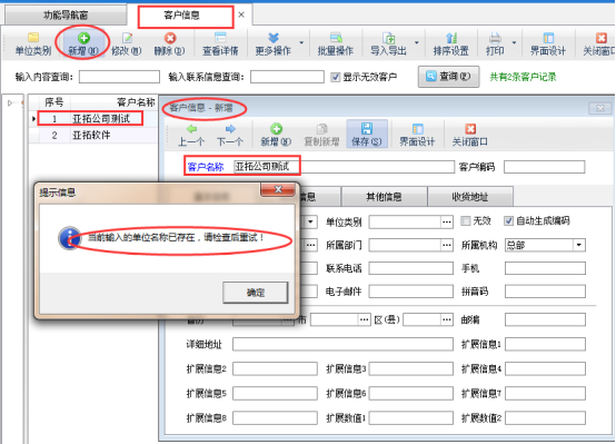 設置完成后,打開功能導航窗的“基礎資料”—》“客戶信息”。對一個已經增加過的客戶名稱,點擊新增按鈕,輸入和之前已增加過的客戶名稱一樣的名稱,保存會提示“當前輸入的單位名稱已存在,請檢查后重試!”,如下圖所示: