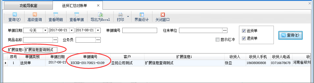 設置后關閉送貨匯總對賬單界面,然后重新打開,以上設置即可生效,此時送貨匯總對賬單即可根據“擴展信息1”進行查詢,如下圖二所示。