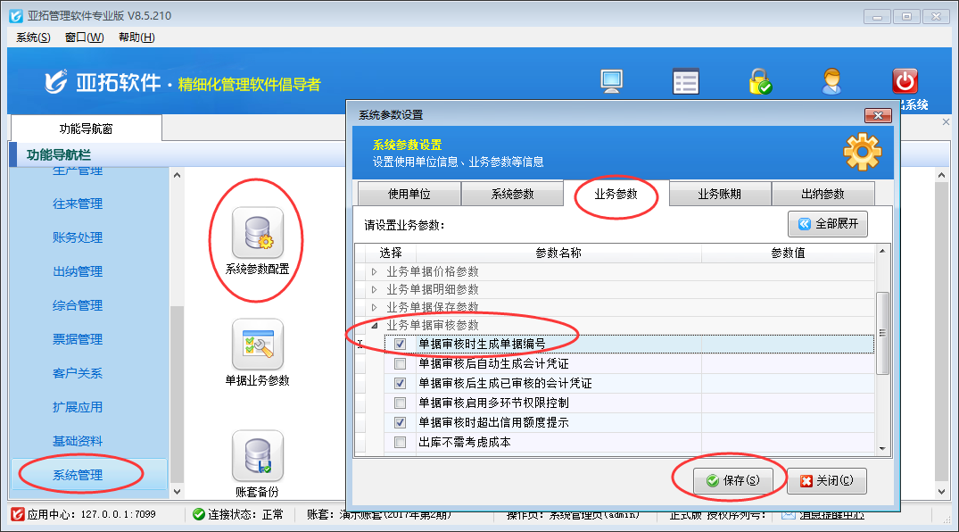 在功能導(dǎo)航窗點擊“系統(tǒng)管理”—》“系統(tǒng)參數(shù)配置”—》“業(yè)務(wù)參數(shù)”,即可進入到“業(yè)務(wù)參數(shù)”配置界面,在業(yè)務(wù)單據(jù)審核參數(shù)內(nèi)打鉤啟用“單據(jù)審核時生成單據(jù)編號”參數(shù),然后保存,如下圖一所示。