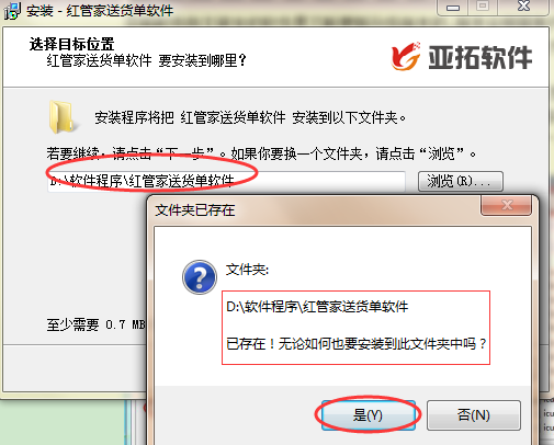 刪除后邊重復的內容,點擊下一步,會提示文件夾中已存在軟件,是否繼續安裝在此文件夾,點擊“是”表示覆蓋安裝到之前的文件夾中。如下圖3所示: