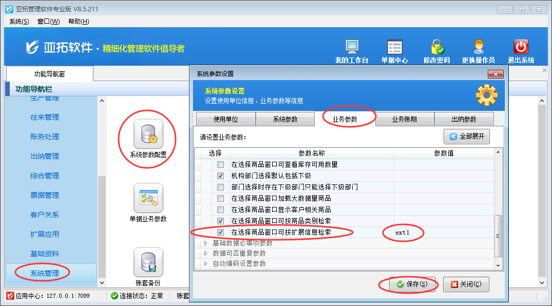 在功能導航窗點擊“系統管理”——》“系統參數設置”——》“業務參數”可以進入到“業務參數”配置界面,在數據選擇參數內打勾啟用“在選擇商品窗口可按擴展信息檢索”參數,并設置參數值(擴展信息字段名),默認為“ext1(擴展信息1)”,如下圖一所示。