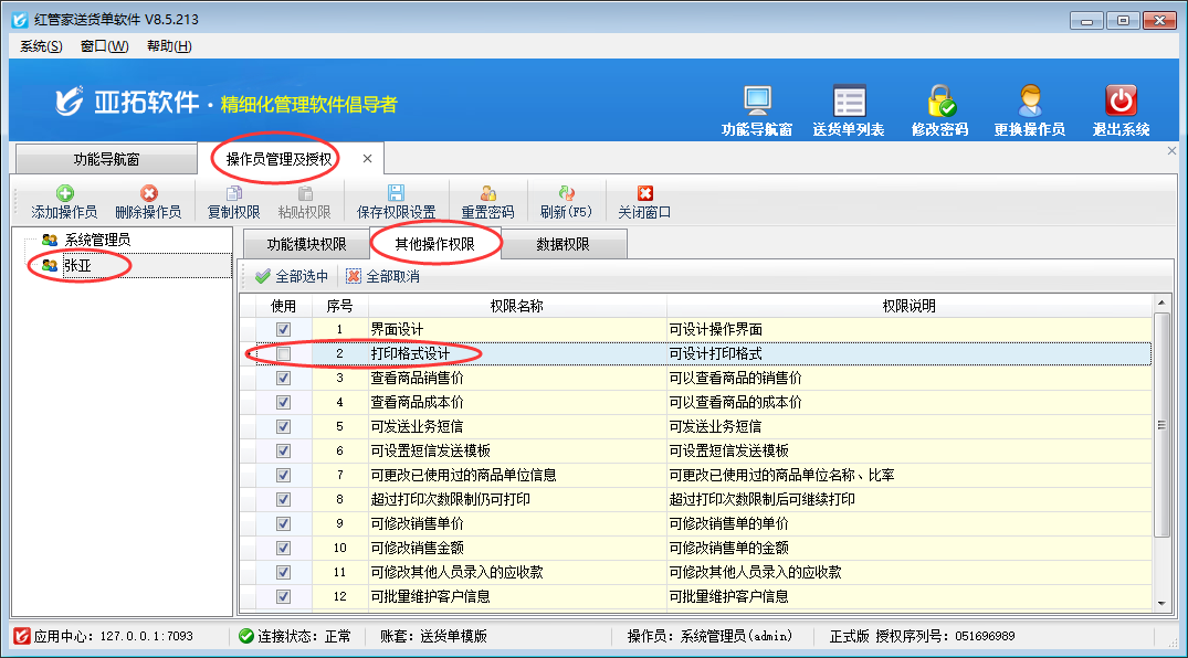 在功能導航窗點“系統管理”→“操作員及授權”即可進入“操作員管理及授權”界面,選中操作員賬號,在“其他操作權限”界面將“打印格式設計”權限打鉤取消,然后保存權限設置,如下圖一所示,設置操作員“張亞”沒有“打印格式設計”權限。