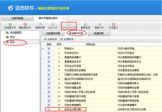 在功能導航窗,點擊“操作員管理及授權”,進入操作員管理及授權頁面,選擇需要設置的操作員“王亞”(系統管理員默認具有所有權限,不允許修改),打開“其他操作權限”,在最后一個權限“應收應付款對賬”勾選符號取消,然后保存操作員權限。如下圖1所示: