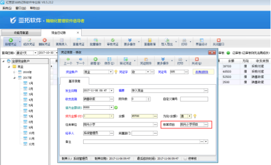 在功能導(dǎo)航窗點(diǎn)擊“出納管理”—》“現(xiàn)金日記賬”,新增日記賬憑證時(shí)需要輸入“核算項(xiàng)目”,如圖1所示。