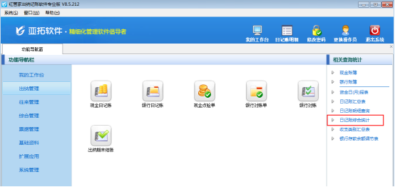 然后在“出納管理”模塊最右側(cè)的“相關(guān)查詢(xún)統(tǒng)計(jì)”內(nèi)點(diǎn)擊“日記賬綜合統(tǒng)計(jì)”,如圖2所示,系統(tǒng)打開(kāi)“日記賬綜合統(tǒng)計(jì)”界面,如圖3所示。