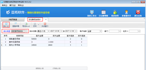 在“日記賬綜合統(tǒng)計(jì)”界面,統(tǒng)計(jì)類(lèi)型選擇“按核算項(xiàng)目統(tǒng)計(jì)”,然后點(diǎn)擊“統(tǒng)計(jì)”按鈕,可以根據(jù)核算項(xiàng)目進(jìn)行統(tǒng)計(jì)。另外,系統(tǒng)支持根據(jù)日期、賬戶(hù)名稱(chēng)、部門(mén)、經(jīng)手人等條件進(jìn)行統(tǒng)計(jì)查詢(xún)。