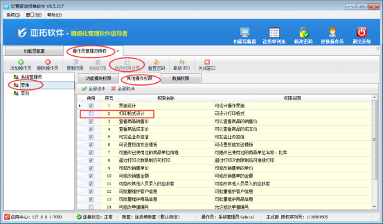 亞拓軟件自主研發(fā)的亞拓管理軟件、紅管家送貨單軟件、紅管家票據(jù)打印軟件、紅管家倉(cāng)庫(kù)管理軟件都支持自定義設(shè)計(jì)打印模板,打印模板設(shè)計(jì)完成后,為了避免操作員修改錯(cuò)打印模板,軟件可以設(shè)置操作員的打印模板設(shè)計(jì)權(quán)限。(系統(tǒng)管理員默認(rèn)具有所有權(quán)限,不允許修改)。