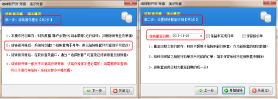 點擊“結轉新開賬”會彈出結轉新開賬界面,分成兩步操作,第一步:結轉操作提示;第二步:設置結轉截止日期。如下圖2所示: