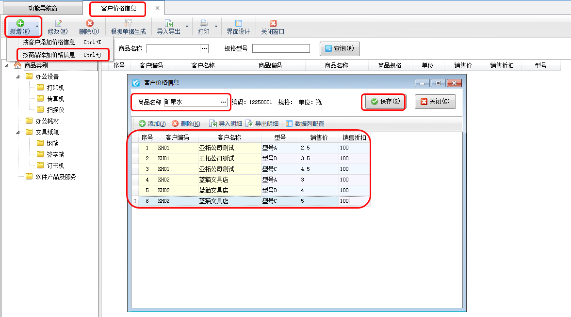 設置完成之后,在“基礎資料”——》“客戶價格信息”內,根據商品添加不同型號的不同客戶的銷售價格信息,如下圖二、圖三所示,設置“礦泉水—型號A”的“亞拓公司測試”銷售價為2.5元,“礦泉水—型號B”的“亞拓公司測試”銷售價為3.5元,“礦泉水—型號C”的“亞拓公司測試”銷售價為4.5元。