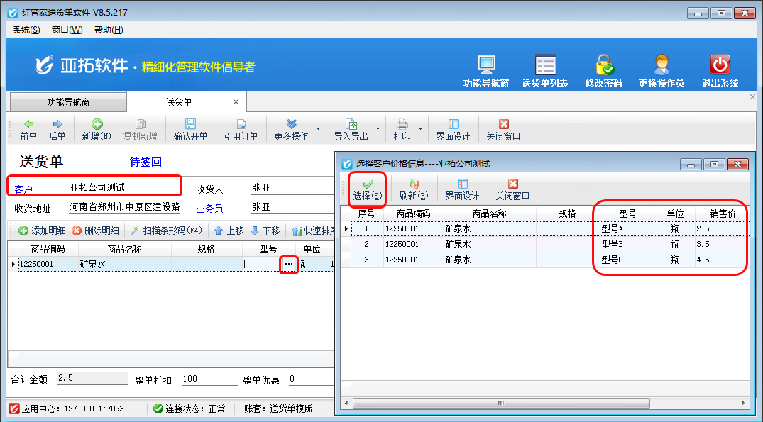 設置完成后,我們新開一個送貨單驗證一下,選擇客戶“亞拓公司測試”,然后添加商品“礦泉水”,然后在商品明細中點擊“型號”后的“...”選擇按鈕,在彈出的選擇客戶價格信息界面可以選擇商品不同的型號最近價,如下圖五、圖六所示。