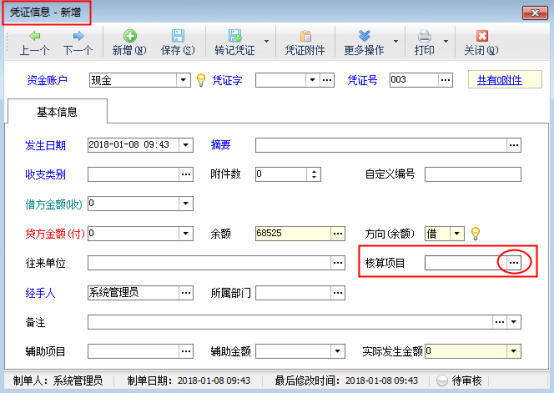 在功能導航窗點擊“出納管理”—》“現金日記賬”即可打開“現金日記賬”界面,在新增憑證窗口,如圖1所示,軟件支持直接輸入日記賬憑證的核算項目,也支持從數據字典中選擇已有的核算項目。