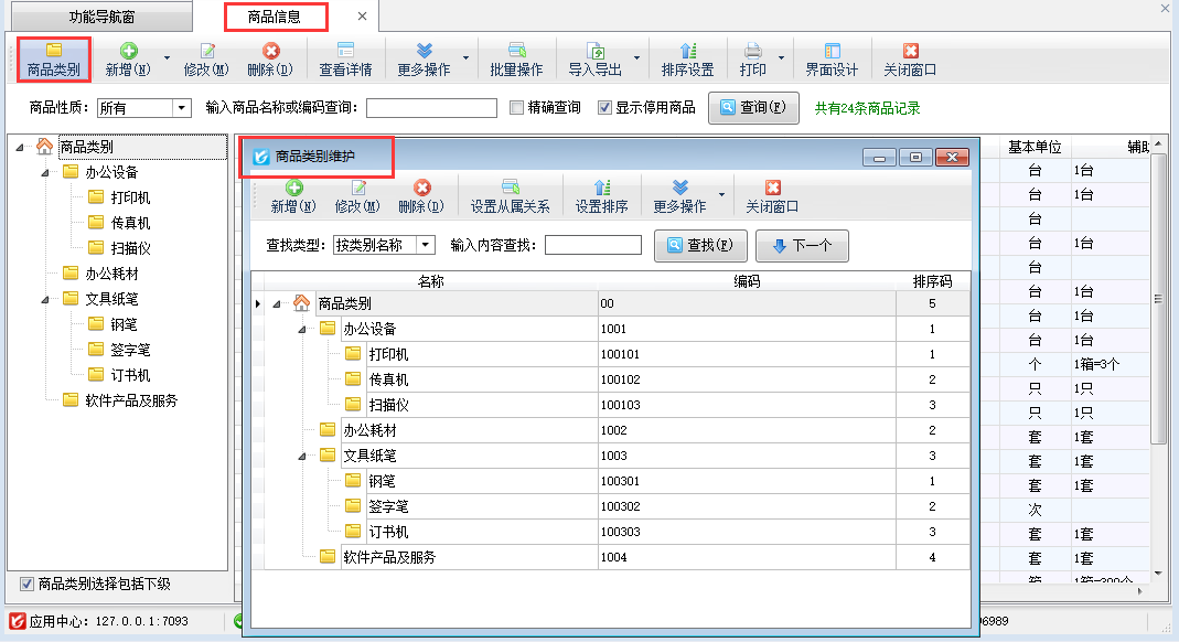 在功能導航窗點擊“基礎資料”—》“商品類別維護”即可打開“商品類別維護”窗口,如圖1所示,在“商品類別維護”窗口可以進行新增、修改、刪除、設置從屬關系、導入導出商品類別等操作。