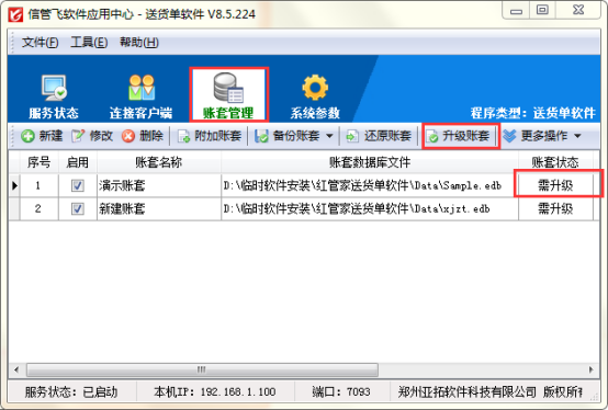 本文章以信管飛送貨單軟件為例,示范升級(jí)版本后賬套如何升級(jí)操作。軟件升級(jí)的版本可以直接在官網(wǎng)上下載最新版本,然后覆蓋安裝在原路徑中。安裝完成后,打開應(yīng)用中心程序,可以在賬套管理中看到賬套狀態(tài)為“需升級(jí)”狀態(tài)。升級(jí)賬套有以下兩種方法。