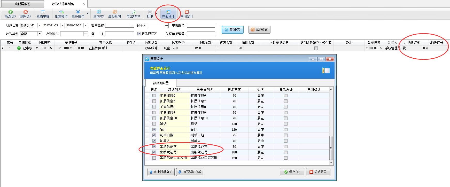在功能導航窗點擊“往來管理”—》“收款結算單”即可打開收款結算單列表界面,然后通過工具欄內“界面設計”功能可以將“出納憑證字”及“出納憑證號”數據項配置顯示出來,可以快速查看到收款結算單轉記的“出納憑證字”及“出納憑證號”,如下圖一所示。然后選中一個存在轉記出納憑證記錄的收款結算單,點擊工具欄中“更多操作”—》“查看相關出納憑證”按鈕(如圖二所示),即可快速打開相關出納憑證界面,查看相關出納憑證詳情(如下圖三所示)。