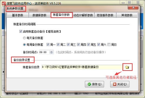 本篇文章以信管飛送貨單為例,示范下如何修改賬套備份存儲目錄,打開應用中心程序(紅色圖標),點擊“系統參數”進入參數設置界面,選擇“賬套備份參數”,在賬套目錄設置中,可以修改默認目錄,如下圖1所示: