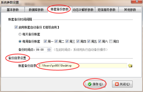 設置好備份目錄后,返回至應用中心程序“賬套管理”界面,選擇一個賬套,點擊“備份賬套”可以看到彈出的備份賬套的界面保存目錄為設置的保存目錄“桌面”上,如下圖3所示: