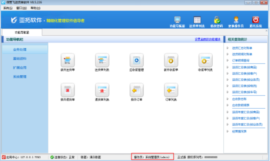 亞拓管理軟件、信管飛送貨單軟件、信管飛倉庫管理軟件、信管飛出納記賬軟件、信管飛票據打印軟件等安裝后默認登錄的操作員為“系統管理員”,如圖1、圖2所示。部分用戶在使用軟件時需要將“系統管理員”修改為自己的名字,在軟件內如何修改呢?本篇文章以信管飛送貨單軟件為例詳細介紹一下如何修改“系統管理員”名字?