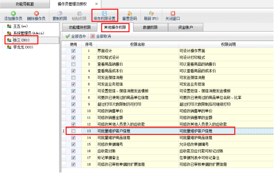 在功能導航窗點“系統管理”—》“操作員及授權”即可進入“操作員管理及授權”界面,選中操作員賬號,在“其他操作權限”界面將“可批量維護客戶信息”權限打鉤取消,然后保存權限設置,如下圖1所示,設置操作員“張三”沒有“可批量維護客戶信息”權限。