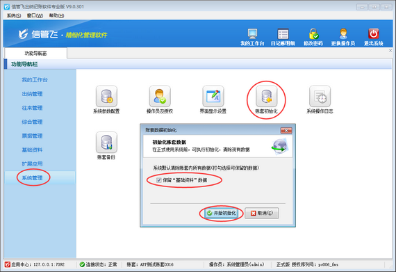 默認初始化會刪除軟件內所有數據,我們可以根據自己的實際需要去選擇需要保留或刪除“基礎資料”,可打勾選擇要保留的數據內容。點“開始初始化”按鈕等待軟件執行完成即可,如下圖2所示。