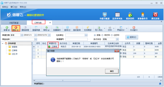 信管飛送貨單軟件、信管飛RMS軟件等支持開銷售單之前先開訂單。銷售單可以引用訂單進行開單。對于剛下訂單出錯或者取消訂單的,軟件支持刪除訂單操作。以信管飛送貨單軟件為例,示范下如何刪除已審核的訂單單據?