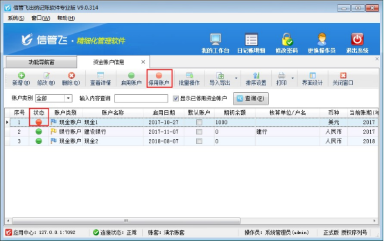 信管飛財務(wù)出納記賬軟件可以同時建立多個資金賬戶,進行管理多個資金賬戶賬目,在實際業(yè)務(wù)需求中可能會出現(xiàn)資金賬戶變動,需要停用之前賬戶及設(shè)置在出納日記賬中不顯示此賬戶,我們以“信管飛出納記賬軟件專業(yè)版”為例示范下如何停用資金賬戶及設(shè)置不顯示。