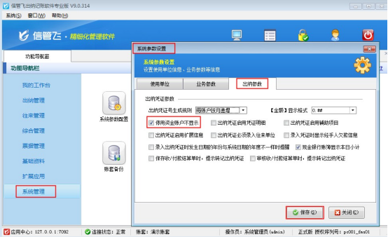 在功能導航窗選擇“系統(tǒng)管理”—》“系統(tǒng)參數(shù)配置”—》“出納參數(shù)”,在“出納參數(shù)”界面把“停用資金賬戶不顯示”勾選啟用,然后保存參數(shù)配置,如下圖2所示: