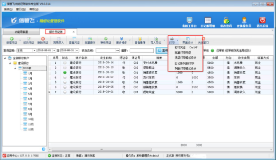 在現金日記賬界面,在工具欄的打印按鈕下選擇“打印憑證”和“日記賬列表打印”可以打印當前列表的一條具體憑證信息和列表憑證信息,如下圖所示: