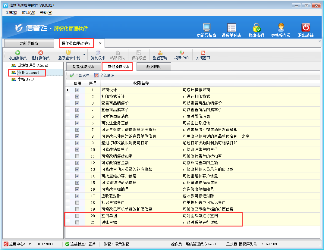 信管飛送貨單軟件支持在送貨單列表對送貨單進行簽回、過賬操作。如果不允許操作員對送貨單進行簽回、過賬操作,可以取消操作員“簽回單據”、“過賬單據”的權限。下面我們介紹一下在信管飛送貨單軟件中設置操作員不可簽回、過賬送貨單的操作步驟。
