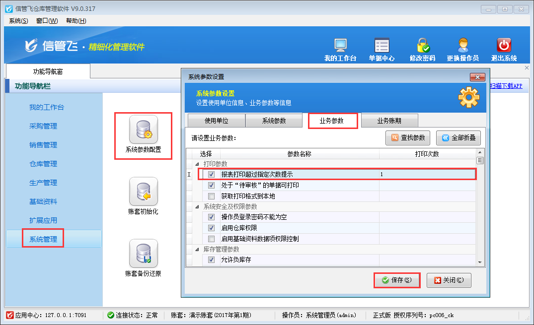 在業(yè)務(wù)參數(shù)界面將打印參數(shù)內(nèi)“報(bào)表打印超過(guò)指定次數(shù)提示”勾選上,并將打印次數(shù)設(shè)置一下,軟件中默認(rèn)的打印次數(shù)是1,可以根據(jù)自己的實(shí)際需求進(jìn)行設(shè)置,最后進(jìn)行保存。