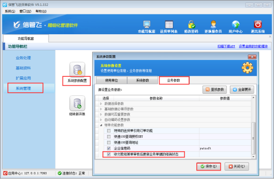 首先需要啟用參數“收付款結算單審核后更新業務單據的結銷狀態”,如下圖所示,在功能導航窗選擇“系統管理”—》“系統參數配置”—》“業務參數”中的特殊功能參數中,勾選啟用此參數,然后保存配置。參數配置完成后,打開“業務處理”—》“送貨單列表”界面,在界面設計中把數據項“已結算金額、結算余額、結算狀態”勾選顯示,保存界面設計,如下圖所示: