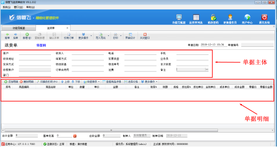 信管飛送貨單軟件業務單據的界面分為單據主體及單據明細兩部分,如圖1所示,單據默認值功能是對單據主體的部分數據項進行設置默認值,業務單據設置默認值后,每次新增單據時會顯示已設置的數據項默認值。