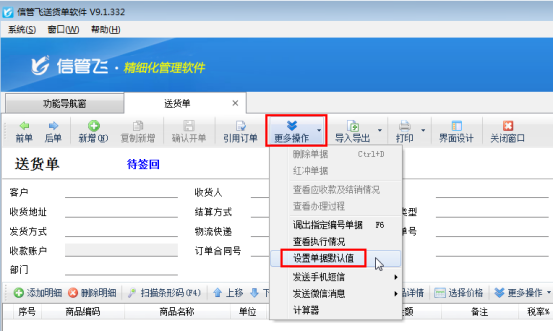 下面我們以信管飛送貨單軟件為例詳細介紹下如何設置單據默認值。