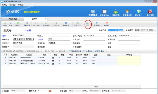 打開一個已經開好的送貨單,點擊“打印”—》“打印預覽”,可以打開送貨單打印預覽界面,如圖1、圖2所示。