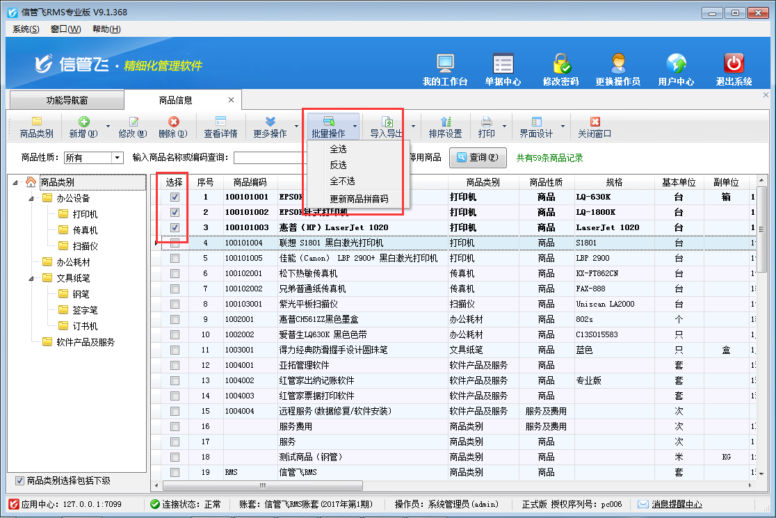 在功能導航窗選擇“基礎資料”—》“商品信息”進入商品信息管理界面,選擇工具欄的“批量操作”按鈕,進入批量操作模式,選擇需要刪除的商品信息(批量操作支持全選、全不選、反選),如下圖所示: