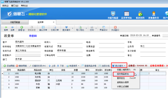 信管飛送貨單軟件、信管飛倉庫管理軟件、信管飛RMS開單時,當商品存在打折情況時,支持錄入商品的折扣率。當商品明細的內容比較多時,為了快速開單,提高效率,可以批量更新單據明細中的折扣率。
