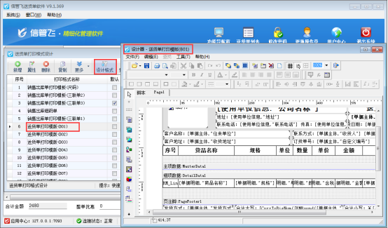 以信管飛送貨單軟件的模板為例,示范下如何修改模板中的金額小數(shù)位顯示格式。打開一個(gè)送貨單,在打印按鈕下選擇“打印格式設(shè)計(jì)”,在打印格式設(shè)計(jì)界面,選擇示例模板“送貨單打印模版(B01)”,點(diǎn)擊“設(shè)計(jì)格式”,進(jìn)入模板設(shè)計(jì)器界面,如下圖所示: