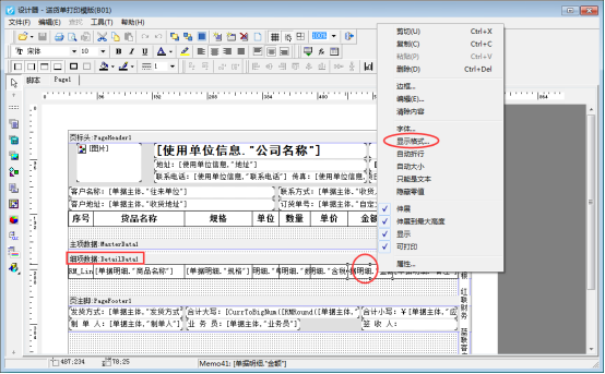 在模板設(shè)計(jì)器界面。單擊“細(xì)項(xiàng)數(shù)據(jù)”中的金額文本框,然后鼠標(biāo)點(diǎn)擊右鍵,會彈出一列選擇,選擇“顯示格式”,進(jìn)入格式設(shè)置界面,修改小數(shù)位,確認(rèn)保存即可。如下圖所示: