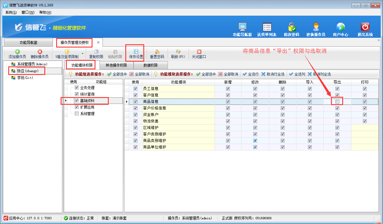 在功能導航窗點擊“系統管理”—》“操作員及授權”打開操作員管理及授權界面,選擇操作員“張亞”,在功能模塊權限界面,選擇“基礎資料”—》“商品信息”,在導出權限下,把商品信息“導出”權限勾選取消后保存權限,如下圖1所示: