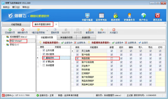 信管飛送貨單軟件、信管飛RMS軟件、信管飛倉庫管理軟件等都支持維護商品信息和允許設置多個操作員登錄軟件,為了避免開單時不同操作員同時新增商品出錯,軟件可以控制操作員的權限,使操作員開單時不能直接新增商品信息只能選擇添加好的商品信息。