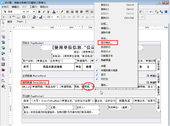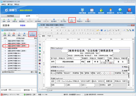 打開(kāi)一個(gè)送貨單,點(diǎn)擊“打印”—》“打印格式設(shè)計(jì)”,在打印格式設(shè)計(jì)界面,選擇示例模板“銷售出庫(kù)單打印模版(三聯(lián)單3)”,點(diǎn)擊“設(shè)計(jì)格式”,進(jìn)入模板設(shè)計(jì)器界面,如下圖所示:
