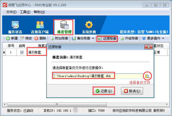 點擊“備份”后,賬套備份數(shù)據(jù)保存在桌面上,備份數(shù)據(jù)名字為“演示賬套.dbk”(可自己取名字),把這個賬套備份數(shù)據(jù)復(fù)制到新電腦的桌面上,新電腦需要提前安裝好軟件,軟件安裝包可到信管飛軟件官網(wǎng)上下載(軟件下載地址),然后進行備份數(shù)據(jù)還原操作,還原操作也是在應(yīng)用中心程序上,在“賬套管理”界面選擇賬套后(沒有賬套可以先新建賬套)點擊“還原賬套”選擇桌面上的賬套備份數(shù)據(jù):演示賬套.dbk,點擊還原后,數(shù)據(jù)就會恢復(fù)到新電腦上,如下圖所示: