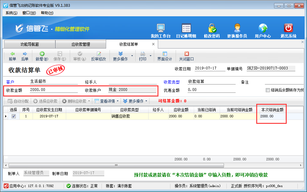 注意:收款結算單單據明細中“本次結銷金額”的合計金額,必須等于可結銷金額(收款金額 + 優惠金額),否則無法保存收款結算單。