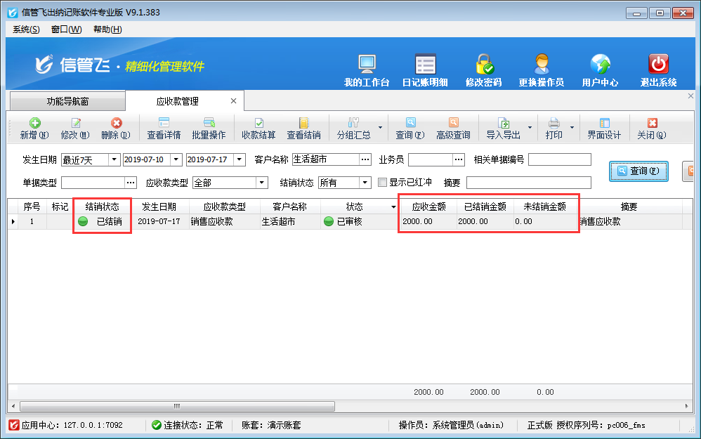 收款結算單單據審核之后,更新應收款的結銷狀態,在應收款管理界面可以查看應收款結銷情況,如下圖所示,客戶“生活超市”應收金額2000元已結銷,未結銷金額為0。