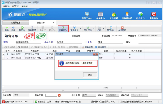 歡迎下載試用可控制訂單發貨完成不允許修改和紅沖功能的軟件:信管飛倉庫管理軟件