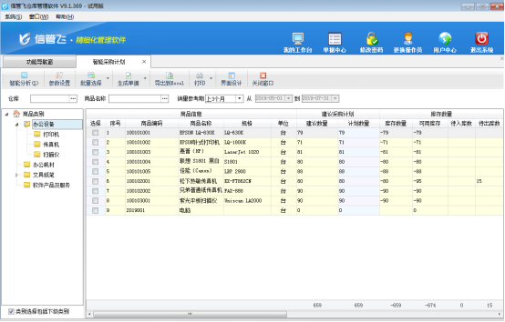 信管飛倉庫管理軟件支持由智能采購計劃生成采購計劃單。智能采購計劃可根據當前庫存情況,并可結合庫存上下限、同期銷售量、銷售訂單數量、待審核數量等條件進行組合運算,從而給出建議的商品采購量。可以把建議結果生成為采購訂單。智能采購計劃具體操作步驟如下:
