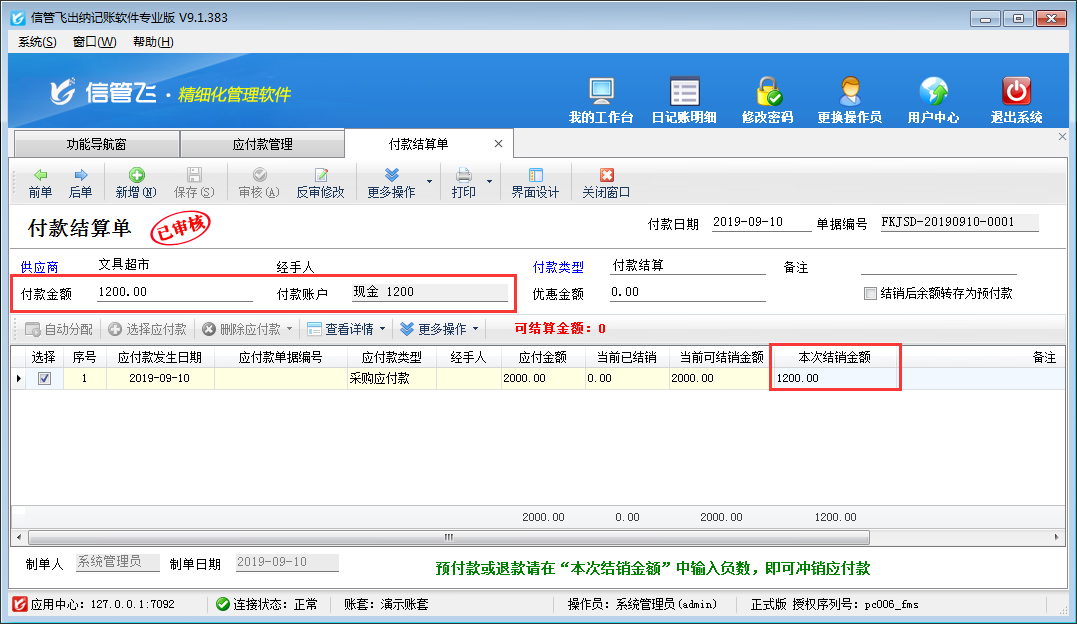 如下圖所示,供應商“文具超市”應付金額為2000元,已結銷金額為0。我們在給供應商支付貨款時只能支付1200元,剩余800元以后在付款。