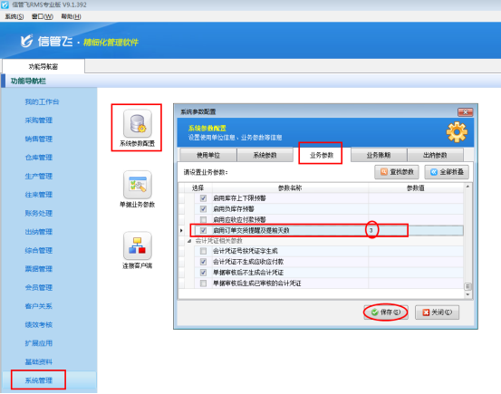 在功能導(dǎo)航窗點(diǎn)擊“系統(tǒng)管理”—》“系統(tǒng)參數(shù)配置”—》“業(yè)務(wù)參數(shù)”,打勾“啟用訂單交貨提醒及提前天數(shù)”,在參數(shù)值內(nèi)可以錄入需要提前的天數(shù),再保存設(shè)置,如下圖所示: