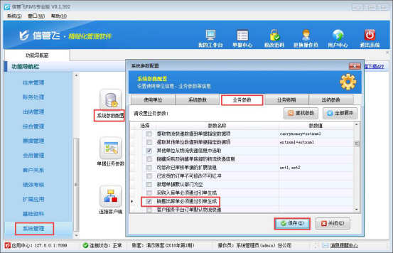 本文以“信管飛RMS專業版”為例,示范如何設置銷售出庫單只能通過引單生成。在功能導航窗選擇“系統管理”—》“系統參數配置”在業務參數的“業務單據相關參數”中勾選啟用參數“銷售出庫單必須通過引單生成”,保存參數配置,如下所示: