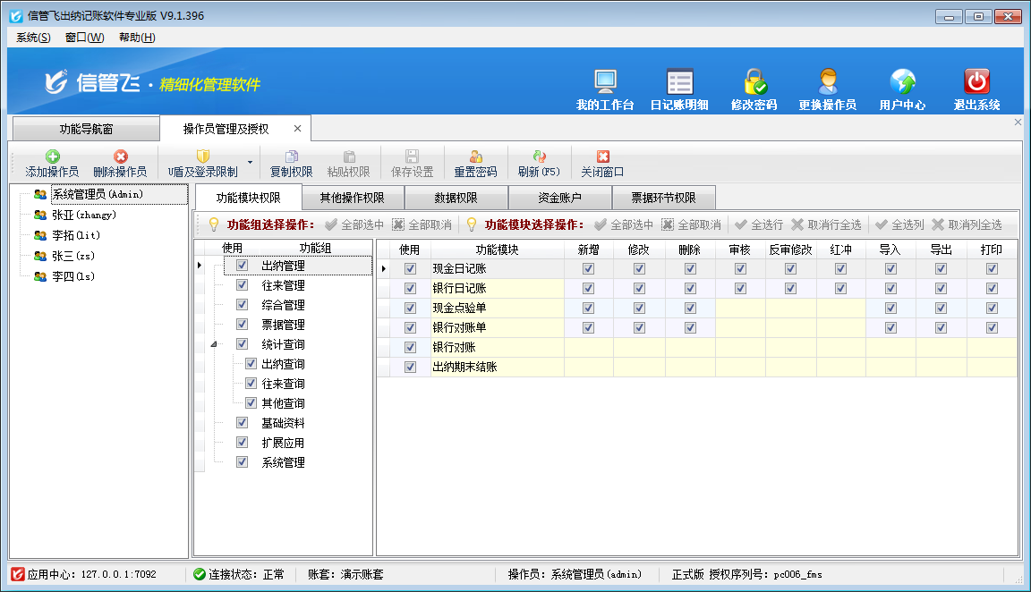 設(shè)置操作員權(quán)限:操作員賬號(hào)添加后,請(qǐng)選中操作員賬號(hào),然后在其右側(cè)可以設(shè)置操作員可操作的功能模塊權(quán)限、數(shù)據(jù)權(quán)限及其他操作權(quán)限。設(shè)置功能模塊權(quán)限的時(shí)候,注意功能模塊權(quán)限打勾選擇“使用”后,還需要設(shè)置詳細(xì)的操作權(quán)限(如新增、刪除、審核、反審修改、紅沖、導(dǎo)入、導(dǎo)出、打印等),如果不設(shè)置詳細(xì)的模塊操作權(quán)限,則只能進(jìn)入功能模塊,但無法執(zhí)行任何操作。