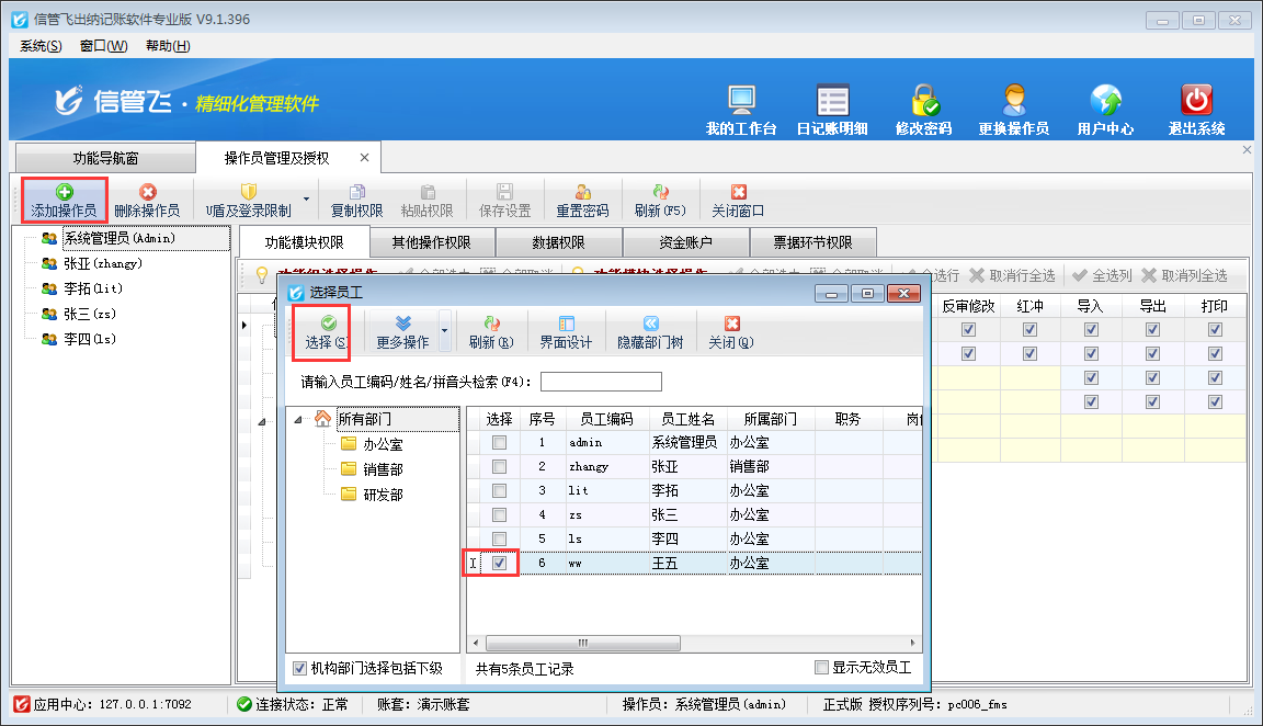 添加操作員:可以將“員工信息”中的員工設(shè)置為操作員,支持批量設(shè)置。點(diǎn)擊“添加操作員”按鈕,然后在打開的“選擇員工”窗口勾選相應(yīng)的員工后點(diǎn)擊“選擇”按鈕添加操作員。